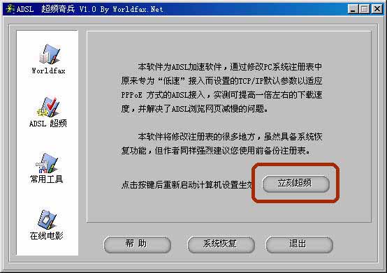 它的使用很简单,如图1所示,点击上面的“立刻超频”按钮,然后按照提示重新启动就可以了。由于ADSL超频奇兵会修改注册表的很多地方,虽然你可以点击图1(