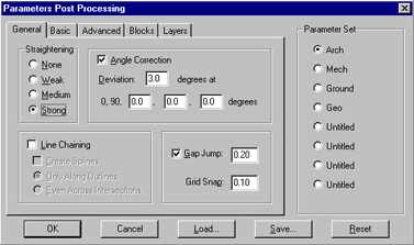 将线宽增加到3个单位。执行Vectorize\Vectorize进行矢量化,然后执行Options\Parameter Post Processing设置后处理参数。可根据光栅图的类型选择不同的后处理参数,如机械图、建筑图、地形图、电路图等。本例中调入预先定义好的文件Tutor.pcf,,再执行Vectorize\Post Processing进行后处理。