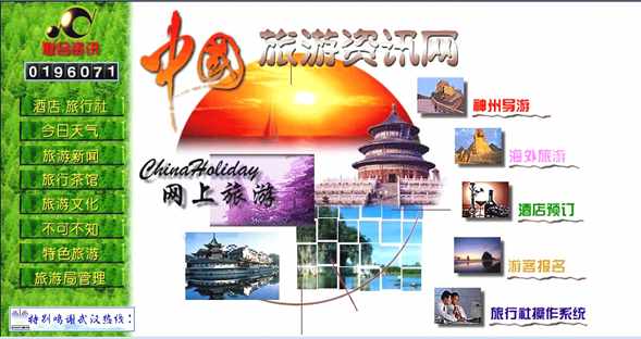 国家旅游局中国旅游信息网,是个多媒体信息网络。提供旅游信息, 满足旅游者的不同需求。据说还将迅速开通网上预订功能,使国内外旅游者不用出门便可预订中国各地的旅行社、饭店、餐馆等。主要内容包括:综合介绍、旅游景点、旅行社、旅游线路、旅游常识、旅游机构娱乐信息、特色旅游、中国公民出国游。