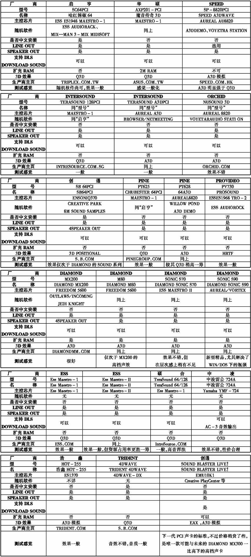 98年是计算机各类硬件设施突飞猛进、大发展的一年,从CPU到3D加速,从AGP到440BX,这其中引人注目的还有多媒体先锋派──PCI声卡。ISA时代的声卡在PCI的冲击下也许很快就会一去不返,创通雄霸天下的日子也不会再那么好过了。以下是就22款流行PCI声卡进行测试一览表,希望能对购卡的朋友有所收益。