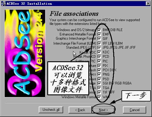 最后,安装程序将要求设置ACDSee32可以浏览查看哪些图像格式文件。