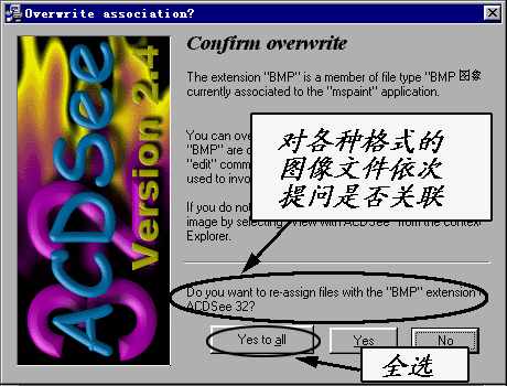 安装程序拷贝结束后,将弹出关联设置窗口。关联是指当双击某图像文件时,是否由ACDSee32来打开浏览、查看。如果是经常用另外的图像软件来编辑某些格式的图像文件,就可不设置该图像文件的关联。如果只是对“秀图(Show)”感兴趣,不妨来个“Yes to all”(全部选择),完全将ACDSee32设置成Windows的专门图像浏览器,因为ACDSee32打开关联的图像文件速度实在很快,是任何其它图像浏览工具都赶不上的。