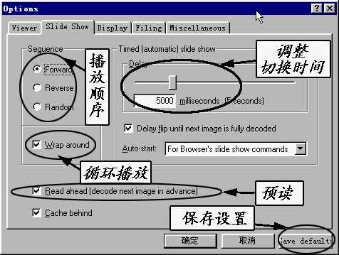 点击工具条上的幻灯片显示按钮(图7),ACDSee32就可按一定的间隔时间来自动顺次显示目录中的图像,也可在界面中点击鼠标右键,然后选择“Slideshow”项。注意,前面所提的功能都可用鼠标右键菜单完成。点击工具条上的ACDSee32设置图标按钮或选择菜单“Tools\Options”等弹出幻灯片播放的设置窗口(“Slideshow”标签项),进行适合自己需要的设置。