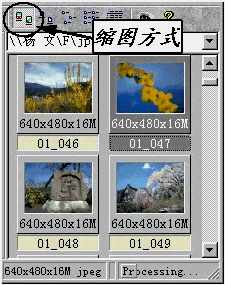 在工具栏上选择浏览查看的方式,一般可以选择图像缩图浏览方式,这样ACDSee32就会在文件窗口以缩图的形式显示文件的图像,如果“窗口”开得够大的话,可以排列三十个以上的缩图,这对该目录下的图像全面浏览、查找、比较会非常方便。可以使用鼠标或光标键移动来选择文件,凡是选择的文件在预览窗口中就会显示出预览图像。双击图像文件或按“Enter”键就可以回到查看界面来更好地观察图像。