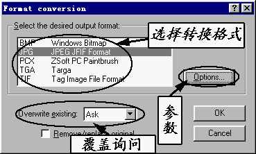选择菜单“Tools\Convert”,打开图像文件格式转换窗口,ACDSee32可以将选中的图片转换成BMP、JPEG、PCX、TIF、TGA五种格式。