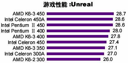 ),在打开3DNow!支持后,K6-3在Quake2和Unreal中的表现与同频PⅡ不相上下。而一旦无法得到3DNow!的支持,K6-3的游戏表现就大打折扣(