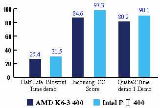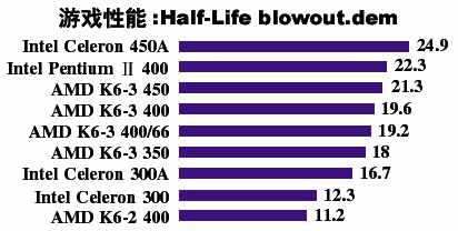 ),降幅最高达30%。在尚未针对3DNow!优化的Half Life中(以后会推出支持3DNow!的补丁),PⅡ强劲的浮点性能显示出优势,PⅡ 400的成绩也要超过K6-3 450 5%。即便如此,K6-3比前辈K6-2却也有50%以上的提高(