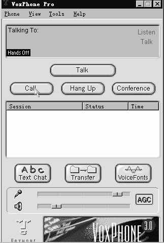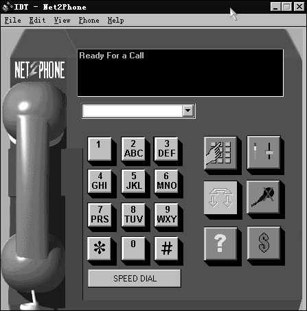 要想将IP电话拨打到普通的电话上,必须首先购买通话时间。你可以联机到如下地址:http://www.net2phone.com进行购买,只需输入你的信用卡的相关信息就可以了。如果有朋友愿意从他的账号中为你提供一些时间,你可以输入他账号的号码。购买了时间以后,你就可以输入对方的电话号码开始通话了,计费可以查看相应的计费表(Rates)。顺便要指出的是,目前中国也有了Net2Phone的代理公司,如果你需要,不妨访问如下地址:http://www.net2phone.com.cn,有相当详尽的中文技术支持网页,可以解决你的一切疑惑或者烦恼,并针对国内不同的用户有不同的解决方案。而且有最新版本的Net2Phone供你下载。