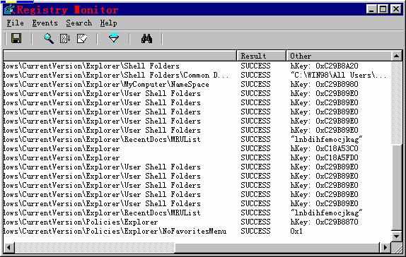 ),并允许用户对记录的信息进行保存、过滤、查找等处理,这就为用户对系统的维护提供了极大的便利。Regmon的使用非常简单,我们只需运行该程序即可启动它的系统监视功能,自动将系统对注册表数据库的读取、修改等操作逐笔记录下来,此后我们就可以凭借它所做的记录从事有关系统维护操作了。具体来说,Regmon所做的记录非常全面,我们可利用它完成许多系统设置工作。如,Windows 98在开始菜单上新增了一个名为“收藏夹”的子菜单,它主要针对网络用户,对未上网的用户而言没有多大实用价值,因此这部分用户就希望能取消开始菜单中的“收藏夹”子菜单。为此,我们可事先启动Regmon,激活其注册表数据库的监视功能,然后启动TweakUI等软件,利用它们的设置功能取消Windows 9X的“收藏夹”子菜单。切换回Regmon之后,我们就可以从它所做的记录中,发现TweakUI是通过将注册表数据库“HKEY_CURRENT_USER\Software\Microsoft\Windows\CurrentVersion\Policies\Explorer”主键下的“NoFavoritesMenu”的“dword”值由0改为1来达到取消“收藏夹”子菜单的目的。再如,当我们在安装某些不具备自动卸载功能的应用软件并手工将其删除之后,该程序就会在注册表数据库中留下一些残余信息,从而影响系统的安全运行,手工修改也比较困难,而利用Regmon则可轻易解决这一问题。我们只需在安装有关软件之前先行启动Regmon程序,将该软件在安装过程中对注册表数据库的修改全部记录下来,然后在卸载该程序时再手工清除注册表数据库中的残余信息即可,从而满足了用户的需要,提高了系统的安全性。