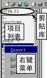 如果要剪贴HTML语言中一个定义标题的标志字符串,可以选择“HTML3.2”剪贴库,然后在下面的项目列表中查找要剪贴的标志名称“H1”,找到后双击该项,语法标志字符“<H1></H1>”就插入到窗口文件中了。也可以用拖动的方法插入到文件中,使用该剪贴库就为编辑网页带来了很大的方便。