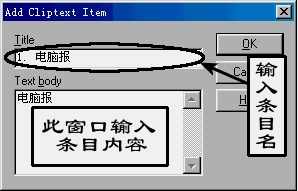 使用者可以增加剪贴库中的剪贴项目,如“HTML3.2”剪贴库中没有设定线宽标志的剪贴项目,要增加这个剪贴项,可以在剪贴窗口的项目栏中单击鼠标右键,在弹出的快捷菜单中选择“Add”项,弹出设置窗口,在其“Title”栏中输入剪贴项名称“BORDER”,在“Textbody”栏中输入要剪贴的字符“BORDER=0”,确定后即可使用该新增的剪贴项了。