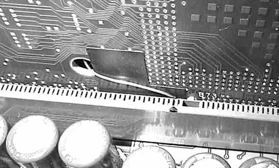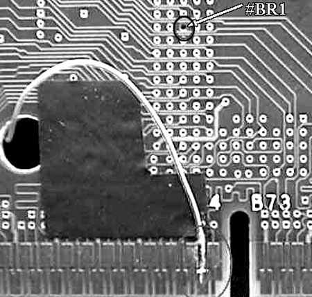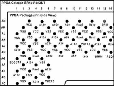好,现在我们按图一步一步来,先切断BR1#到VCC_CORE的连接。找到BR1#引脚,看见了吗,是在SECC板的A面右手边的引脚阵列(就是右下角的那一片),中间一列靠缺口处向下数的第五个引脚(如
