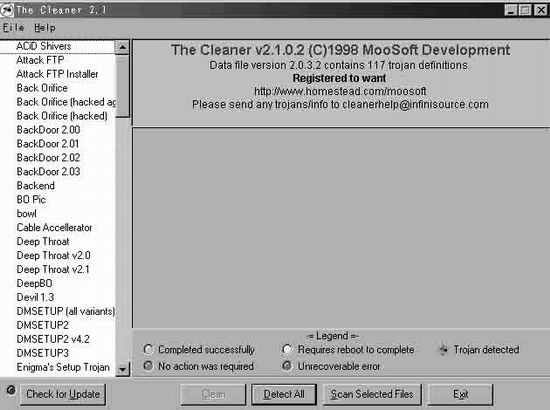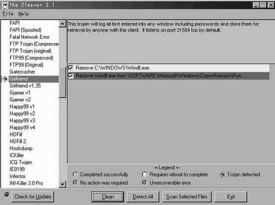 1界面,共分以下几个部分,左边为特洛伊木马列表,多达117种,几乎所有较出名的这里都有,如Netspy、BO、Netbus、Girlfriend、Happy99、BackDoor以及它们的一些不同版本。下边为命令按钮,共五个:Clean 用来清除已发现的特洛伊木马;Detect All检测硬盘中所有的文件,这需要5到10分钟,根据你硬盘大小文件多少而定(笔者2.5G硬盘全部检测一遍用时5分钟),当检测完毕后,将报告检测速度、用时和列出机子中所有已被安装或存在而尚未安装的特洛伊木马;Scan Selected Files 可检测单个文件,单击它,在打开的对话框中选中需检测的文件即可,这个功能对处理我们下载的软件和收到来历不名的软件特别有用;Check for Update 方便上网升级和更新;Exit退出。窗体右上方用于当你单击某个特洛伊木马时将出现对该特洛伊木马的简单描述。因此,通过The Cleaner2.1可以初步了解100多种特洛伊木马的活动情况,对我们防止黑客的攻击大有帮助。右中为查出的本机已有的特洛伊木马及其安装后在系统和注册表中的位置。右下为颜色监视器,绿色为完成清除任务;黄色为要求重新启动电脑才能清除干净;红色的甲壳虫将出现在已发现的特洛伊木马列表中;灰色为无任务;红色为未知错误。笔者为了测试The Cleaner2.1 ,特意下载并运行了Girlfriend,经检测所有文件后,The Cleaner报告发现Girlfriend。单击左边的特洛伊木马列表中的Girlfriend,经二三秒的分析检测,出现如下两个选项,remove c:\windows\windll.exe 和remove windll.exe from \software\microsoft\windows\currentversion\run,前一项为安装后Girlfriend 的所在位置,后一项为Girlfriend 运行后在注册表中的位置,选中这两个选项,点Clean 命令,即可清除Girlfriend。清除后,前一选项变成黄色条块,说明需重新启动电脑才能清除干净,后一选项变成绿色条块,说明注册表中已清除干净(见