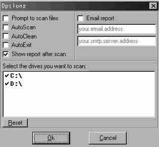 3界面,共六个选项:Prompt to scan files在打开程序时询问是否搜索所有文件Autoscan为启动程序后立即自动搜索;Autoclean在搜索完成后自动清除特洛伊木马,建议不要选此项;Autoexit 搜索或清除后自动退出,将不提交搜索报告;Show report after scan搜索后提交报告;Email report这是个新鲜玩意,可以将搜索报告用E-mail方式发送到指定邮箱中,在第一栏中填写你的E-mail地址,在第二栏中填写发送邮件的服务器地址。更酷的是The Cleaner2.1还提供任务栏命令方式,具体格式如下:cleaner.exe [/a/r /n /m /d /u][/e:emailaddress][/s:smtpserver][/p],其参数解释如下: