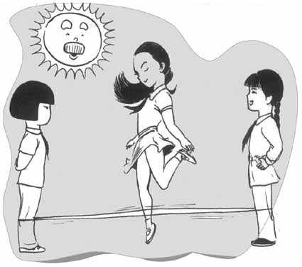 爸爸那时是出差来陪我的,所以除了陪我去医院外,还得忙于公事。我就一天到晚的无所事事地在胡同里游荡。我最喜欢的节目是和两个姐姐跳皮筋,胡同前面的小树成了我们的快乐小天地……在黄昏中,在落日里,那几个扎着马尾巴的小姑娘和她们头上的蝴蝶一样上下翻飞,虽然姐姐们的相貌早已模糊,但那飞荡的欢声笑语确难以忘怀。(
