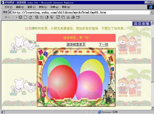 谜语城堡(http://learning.sohu.com/children/)“巷子短短一尺长,开了七个小天窗,阵阵风儿吹进去,吹出乐曲飘四方。”小朋友能猜到这是一种什么乐器吗?在这还有好多这样的谜语等着你去猜,赶快开动脑筋,去猜猜看。(