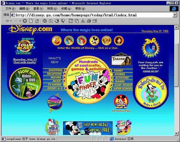 迪斯尼乐园(http://www.disney.com/)这可是全世界最大的动画快乐王国呀!网站中充满了漂亮可爱的卡通形象。别看主页边上的字都很小,一个又一个的链接就躲藏在那些小字和可爱的卡通画片的背后。(
