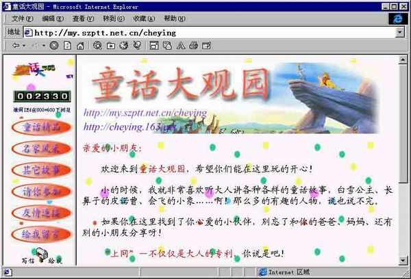 童话大观园(http://cheying.163.net/)里有小朋友非常喜欢的各种各样的童话故事,美丽的白雪公主、长鼻子的匹诺曹、会飞的小象……啊!那么多的有趣的人物,说也说不完。(