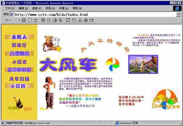 大风车(http://www.cctv.com/kids)小朋友一定都非常熟悉了,但他的网站你知道吗?在那你可以先看到精彩的动画片,以自然和现实生活为内容的儿童专题片,惊险而富有知识的游戏以及品种多样的儿童电视剧介绍,是不是很棒!(