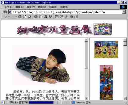 儿童画展(http://infojet.online.tj.cn/shhzhyou/yjhualan/qmh.htm)这里汇集了小画家邱鸣寒的作品。儿童眼里的世界装满着甜甜的梦幻、烂漫的诗情,儿童的画更是一个美妙的空间,喜欢画画的小朋友,不妨到这里来寻找共鸣。(