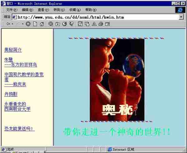 奥秘(http://www.ynu.edu.cn/dd/aomi/html/kwin.htm)集科学性、知识性、艺术性、趣味性于一体,揭示大自然无穷无尽的奥秘,展现人类心灵与意志创造的奇迹,带你走进一个神奇的世界。(