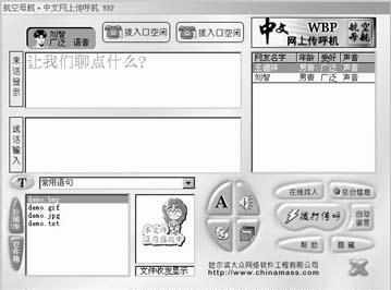 说WBP98是汉字传呼的“精英王”,一点也不为过。它在不依赖服务器和网络带宽的前提下,实现了目前最好的网络电话功能和网络传呼功能,实在值得网友们试一试。在http://www.chinamass.com/wbp/wbpdl.htm网页可以免费下WBP98,下载文件名为wbp.zip,文件大小为5.38MB(够大的)。在这里还有WBP98的参数设置方法介绍,要仔细阅读哟!下载后用WinZip解压安装,重新启动计算机后,通过开始/程序菜单运行即可,设置好参数后就可使用了。实时语音聊天和实时图形交流是WBP最重要的两个特色功能。当设置好计算机上的麦克风和扬声器后(用Windows中的录音机检验麦克风能否录音和放音即可)。联系好你的聊天对象,鼠标指针指向“发送语音”按钮,按住这个按钮就可开始对着麦克风讲话,这时会显示“正在录音”。当说话结束松开按钮,则刚录制的语音资料就会发送出去(