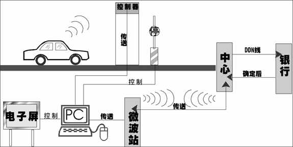 那么,不停车收费是怎样实现的呢?原理是这样的:如果每台汽车都装上一个小型微波发射器,这个发射器发射的微波被安装在收费站、停车场等地方的接收器接收到以后,被传送到收费站的本地PC机上,PC机上安装有专用的软件,此软件根据信号识别出通过的车辆的车型并计算出应缴的费用。经过PC机上安装的软件处理以后的信号被传送到微波发送/接收器上,信号通过微波被传送到微波中心,中心用DDN专线或ISDN专线与银行联接,信号通过这样被传送到银行进行确认,即确认其银行存款余额是否足够缴费,确认的结果又传回中心,中心根据来路发回每个微波发送/接收器上,再传回当地收费站的PC上,PC根据处理的结果做出判断:存款余额足够的话就在收费站的电子显示屏上显示出车型、应付费用、存款余额,同时栏杆打开,车辆通过。如果存款不足,电子显示屏上显示出存款不足信息,同时报警,车辆停行并缴费。整个过程如