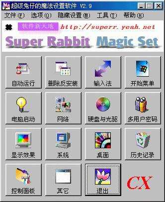 ),所具备的功能比Tweak UI还要多,而且是全中文的,特别为中国用户设计的功能有:调整输入法的顺序、修改当前系统的语言、修改开始菜单的“程序”、“文档”等菜单的名字。可以使用Super Rabbit和Magic Set分别作为注册名和注册码试用,注册费10元,请支持国产共享软件!