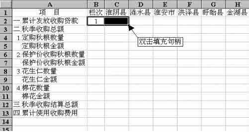 3.对于数字序列的填充,要选定包含初始值单元格在内的两个单元格(如图1中选定B2:C2),然后双击填充句柄。而对于文本序列的填充,只需选定初始值单元格(如图2中选定C2),然后双击填充句柄。