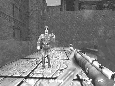 当我被量子传送机送回到1944年的一座教堂时,我被眼前的一切惊呆了,毫不夸张地说,这是我所见到表现力最为丰富的一个游戏场景。这得要感谢来自波兰的开发小组Mirage Media,他们在《纳粹终结者》中采用了一种完全自行设计的游戏引擎。这组引擎非常注重灯光效果,来自各个角落、强弱不同、颜色各异的光线都在考虑范围之内,使得阴影和倒影在游戏中表现得特别真实,在此引擎支持下,大气的效果如:雪、雨、雾和烟也很出色,雪地中的脚印和墙壁上的弹痕清晰可见。