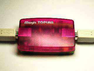 )便是台湾Skywell推出的USB to USB的网络产品TOPLAN。这套产品包含一个USB连接盒(就是这个半透明的盒子),两条USB连接线,当然还有联网的软件。只要两台电脑都有USB接口,就可利用TOPLAN相连接,再安装软件及通讯协议等,就能成为网上邻居,可共享文件、打印机等,也可玩网络游戏。配合Sygate、Wingate、Winproxy等软件还可共享一个MODEM上网,这和两台电脑用网卡连接没多大区别。