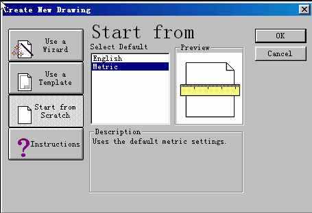 1.开始启动AutoCAD R14后,在Start up对话框中,点击Start from Scratch,在Select Default中选择Metric(公制)(见