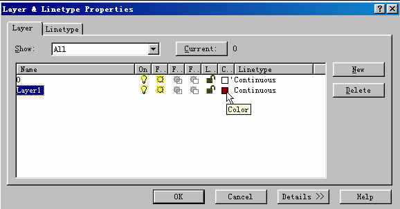 3.设置层:点击层图标,打开Layer&Linetype Properties(层和线型属性)对话框,在缺省突起的Layer标签下进行层的设置。这时列表中只有一层,即0层,点击New按钮,一个新层立即出现在列表中。设计模板时,对层的设置主要是层名、颜色、线型三项,其它各项保持缺省设置即可。新层刚建立时缺省的层名为Layer1,且处于可编辑状态,这时键入你想要的层名即可,如取名为粗实线层。设置层的颜色,只要点击代表颜色的方框(见