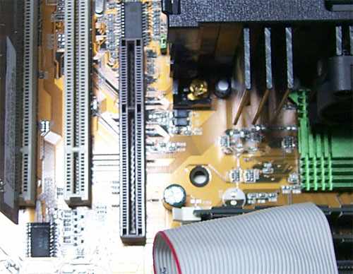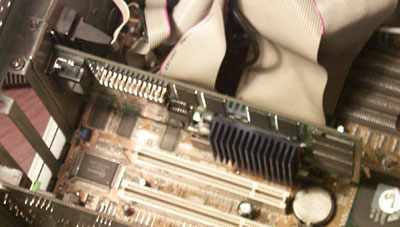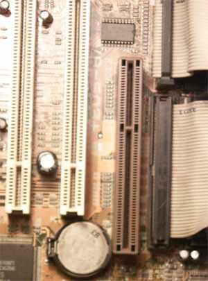接下来我们就要把这块TNT2插进AGP插槽中了,方向不要搞错,有挡板的一侧要朝向机箱外面,装好之后的样子如