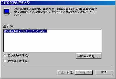 重新启动电脑之后,系统会提示发现新硬件“PCI VGA Compatibility Display Adapter”,而不是你的TNT2。这没有关系,因为你的显卡太新了,去年出的Windows98操作系统不认识它(什么?你用的是Windows95?我昏倒!)。接下来系统会给你两个选择:让Windows搜寻更好的驱动程序(通常是什么也搜索不到)和指定驱动程序的位置。由于我们已经知道驱动程序的位置,所以我们当然选后一项。接下来就是指明驱动程序所在的路径。Windows非常顽固地先去找你的软驱内有没有你所要的东西,不用管它,选择盘符、文件夹,如果没什么差错的话,你就会发现一个被蓝色高亮显示的扩展名为“inf”的文件,再点“确定”,屏幕上就会出现你所需要的驱动程序的名称和一些厂商、版本、发布日期等信息(如