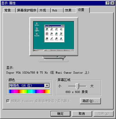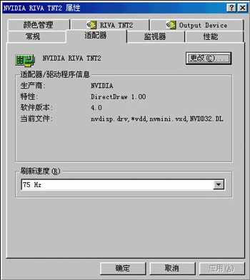 我们已经完成了这块TNT2显卡的硬件和软件安装。为了能让这块显卡在游戏中充分发挥出它的威力,我们要进一步设置这块显卡的有关选项(为简便起见,仅以公板驱动程序为例加以介绍)。首先进入桌面“属性”→“设置”→“高级”→“RIVA TNT2”,出现的窗口如