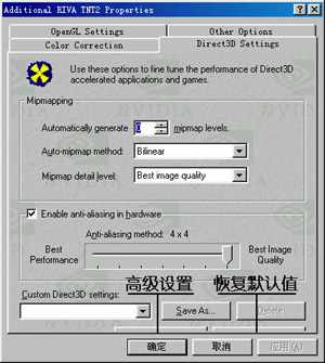 点击这个按钮,哇,柳暗花明又一村,这里隐藏着有关TNT2的大部分优化设置选项。至于具体怎么优化,请参考《电脑报》今年第38期的《RIVA TNT终极优化》一文,虽然该文写的是TNT的优化,但同样适用于TNT2显示卡。不过有两个按钮(如