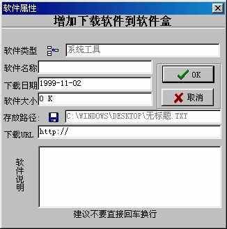 然后填写上软件名称和软件大小,注意填写软件的下载地址,最好多填几个,例如官方下载地址,本地下载地址等,好方便升级和去查找软件的相关信息。最后,点击“确定”就将下载软件的信息添加到下载文件管理盒工具的信息库中去了。