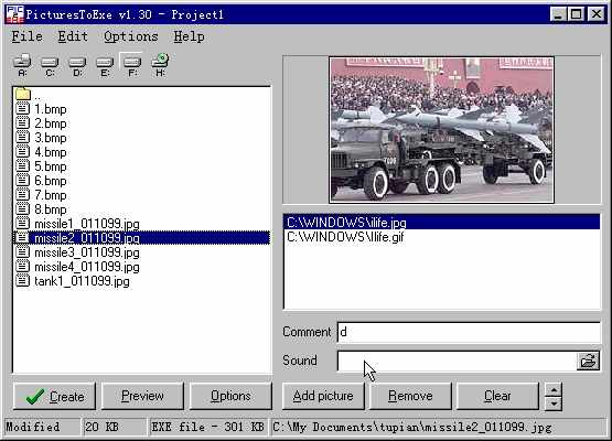 PicturesToExe是一个简单的工具,该工具可以将一幅或几幅图片生成一个可执行文件,运行这个文件,就可以自动在屏幕上显示图片。这个可自动看图的文件只比原来的图片文件大一点,而且可以像幻灯片一样播放多张图片。使用这个工具,可以使别人不用安装任何图像浏览软件,就可以很方便地看到你送去的图片,甚至在DOS系统中也可以轻松地浏览。生成的文件也可以当屏幕保护软件使用。