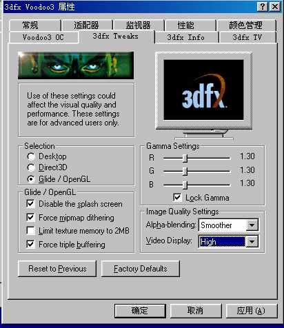 假定你已经正确安装了驱动程序,你将在显示属性里看到“3dfx Voodoo3”一项:在桌面上右键单击选“属性”,点顶端的“设置”然后点“高级”按钮,选择“3dfx Tweaks”选项,这里有不少设置能改变游戏和应用程序的界面和应用方式。