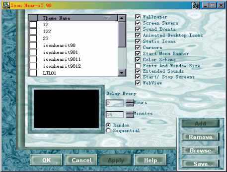 “Theme name”在此列表中“Iconhearit98”和“Sports”两个主题是自带的,其余是对硬盘上已有的各种桌面主题进行扫描后,加入到列表中的。在此可以设置一定时间间隔更换主题,也可以设置为顺序的或者是随机的。