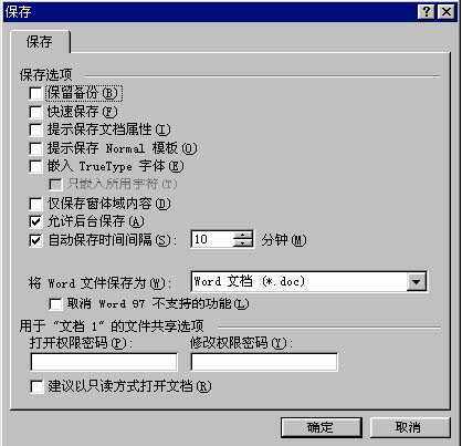 保存或另存WORD2000文档时,在弹出的“另存为”对话框中点“选项”按钮,弹出一下拉菜单,点选其中的“选项”,弹出如