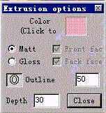 1所示的拉伸设置窗口,这其中包括“拉伸大小”(数字越大立体字越“厚”);“轮廓宽窄”设置(右边是轮廓大小的输入框);“有无光泽”(选择“Matt”为无光泽);“正、反面是否选择”。点击对话窗口上方的色块(也可单击菜单下的“View/Text color”命令),可对立体字的颜色进行修改,如果我们打算对立体字作纹理修饰,只需单击菜单下“View/Text texture”命令,选择一个作为纹理的图片文件(能作为纹理的图片有BMP、JPG、GIF、PNG等格式),选定图片后,右边出现它的预览图,如果满意,单击“打开”即可。