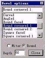单击工具栏上的导角设置按钮(或单击菜单下的“Edit/Bevel”命令)便进入此项设置,它可对立体字的边角进行修饰,它包括导角的程度(下边的Depth输入框)、导角的形状选择、导角形状等项目的设置,如
