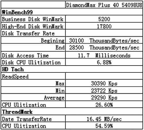 Maxtor DiamondMax Plus 40 54098U8无论在速度和容量上都很出色。它代表了新一代IDE硬盘的特点,因为它的市场定位于高端桌面系统、服务器和初级RAID系统。其容量和价格对普通家庭用户都不是很适合,普通用户可以选择10GB或15GB的金钻四代硬盘,性能和54098U8一样,仅仅是容量较小,可感受一下高速IDE硬盘的效果。(