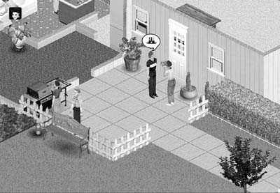 人物之间进行交谈时,头上会冒出对话框,里面的图案表示正在进行交谈的话题。整个游戏中包含有12个话题,但每个人物对不同话题的兴趣分高、中、低三档,这是由他们的性格所决定的,因此同样是不可更改的。当你发现其中一个人的对话框里出现“×”,那就表示此人对这个话题不感兴趣,这时应该马上中止这场谈话。有一种方法可以避免这种尴尬的场面出现,那就是一群人一起会谈。这种情况一般出现在大家一起用餐或者看电视时,游戏自动转换到大家最感兴趣的话题(借此你也可以留心一下人物对哪个话题最感兴趣)。说话的那个人将得到8点交际状态值,并和其它聆听的每个人之间各增加1点友谊度,这是游戏中最安全可靠的交际手段。此外,当人们在一起下棋或者玩桌球时也会进行一些交谈。