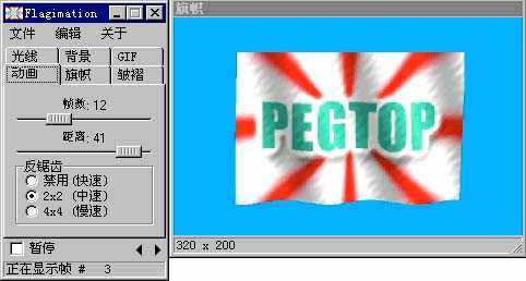 软件名叫Flagimation,它可以很方便地将指定的BMP和JPG格式的图形文件制作成3D旗帜动画。Flagimation的调节功能分为六大项:动画、旗帜、皱褶、光线、背景、GIF。在这六大项里面可以调整旗帜的大小、色彩、方向、风的强度、背景颜色等多种特效,全部采用滑杆、单选操作,而且可以立即从预览窗预览结果。另外你还可以在旗帜上加上文字,它支持中文的哟!不过现在只支持宋体,我得到的是共享版,只能试用14天,并且在将旗帜保存为Gif文件时,旗帜的背景不能是透明的,注册版无此限制,有兴趣的朋友可以到http://zxs99.yeah.net或http://zxs99.126.com去下载。