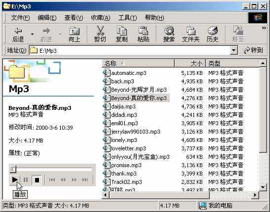 在Windows 2000中,当我们用鼠标指向一个多媒体格式的文件时,(如MID、WAV、MP3、MPG、BMP、GIF等),系统会自动在文件列表左边列出该文件的缩略图:对图形文件会显示出该文件的概貌,对声音及电影文件会出现一个播放条,点一下播放按钮就可以不用打开播放器直接欣赏音乐和观看电影了(如