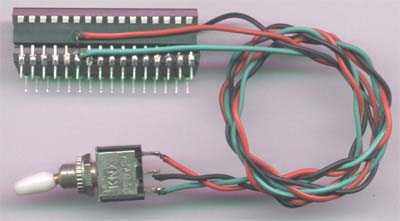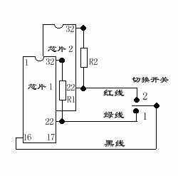 6。把绿色线焊在芯片1的第22号管脚,红色线焊在管座的第22号管脚上,把两个10K电阻分别焊在芯片1第22脚和第32脚、管座的第22脚和第32脚上,注意电阻在芯片管脚的焊接位置,不要妨碍芯片将来的接插。处理好绝缘,滴一滴热熔胶,把引线的焊接部位固定好。把这两根线留足一定的长度后,分别焊在拨动开关的1脚和3脚上,另外一根黑线,一端焊在拨动开关的2脚上,另一端焊在芯片1的第16脚上(芯片的接地线),拨动开关焊接示意图见