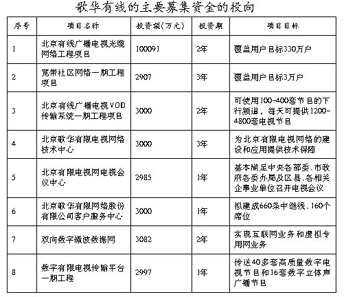 2001年2月8日,全国首家有线电视网络公司──北京歌华有线电视网络股份有限公司8000万A股在上交所上市。从上市公司的募集资金投向看歌华有线真正的魅力就是“网络媒体+传统媒体”。